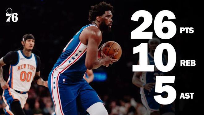 同樣這場比賽,恩比德出戰(zhàn)了33分鐘,投籃15中9,罰球12中8,得到26分10籃板5助攻。