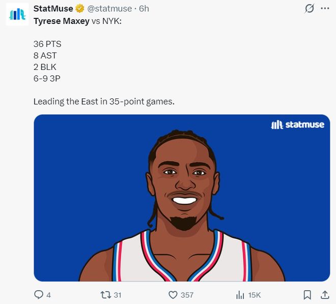 此役馬克西全場比賽37分鐘,22中14,三分9中6,罰球4中2,拿到36分8籃板4助攻1搶斷2蓋帽,命中率63.6%,三分命中率66.7%,他的35+場次在本賽季東部排名第一。
