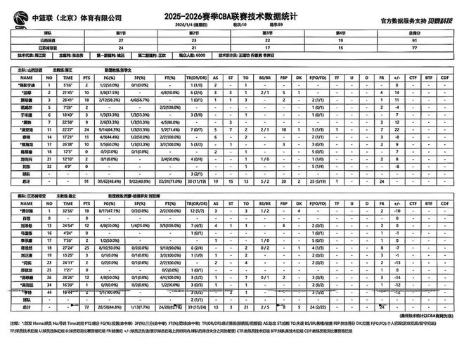 北京時間2026年1月4日19:35,2025-2026賽季CBA聯賽第十輪繼續進行,山西汾酒主場對陣江蘇肯帝亞。兩隊歷史上共交手39次,山西汾酒23勝16負,上賽季常規賽兩隊交手2次,山西汾酒2勝0負。本場比賽,山西隊雖然一直保持領先,但在籃板球的拼搶和保護上依舊存在問題,仍需賽后進一步總結,最終全場比賽結束,山西汾酒91:77戰勝江蘇肯帝亞。