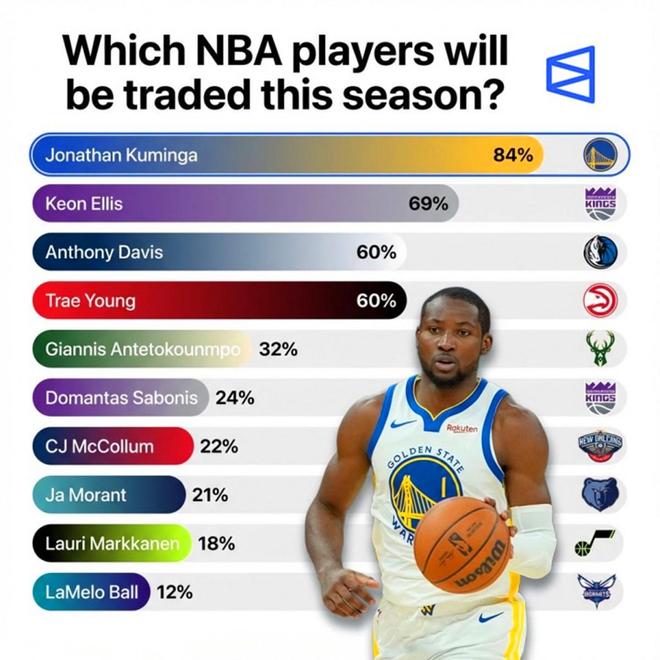 在美媒Polymarket統計的球員交易概率中,字母哥僅以32%排在第五名,遠低于特雷楊(60%)、濃眉哥(60%)、埃利斯(69%)和庫明加(84%)。