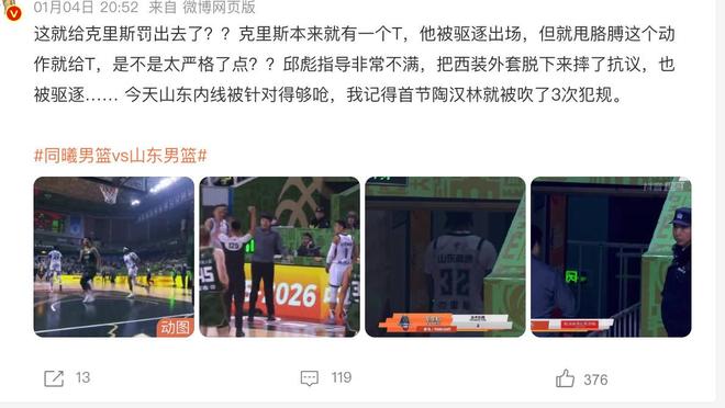 最后一個消息,分享一下邱彪或遭重罰的情況。各位球迷都知道,最近山東隊結(jié)束了一場決戰(zhàn),最終在邱彪的帶領(lǐng)之下,球隊拿到了勝利。而在本場比賽過程當中,主教練邱彪因為不滿意裁判的一些爭議判罰,直接起了爭執(zhí)被驅(qū)逐。當時我們看到邱彪非常的激動,他直接脫掉西裝重重摔在了地上。這個行為也在賽后引發(fā)不少球迷的擔憂,大家都擔心聯(lián)盟極有可能會針對邱彪這樣的做法進行重罰。