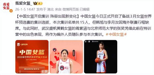 按照中國籃球之隊此前發布的消息, 中國女籃于1月5日正式開啟集訓了,本次集訓名單是15人,不過,韓旭和李月汝都在海外聯賽,將缺席這一次的集訓。