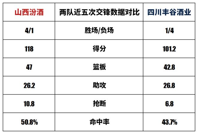 山西汾酒與四川豐谷酒業歷史上一共交手31次,山西汾酒18勝13負。上賽季兩隊交手4次,山西汾酒3勝1負。