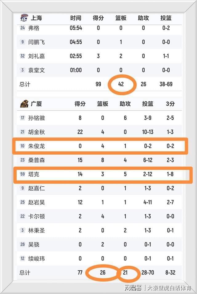 上海隊全場拿到42個籃板球,廣廈隊只有26個,狂輸16個。