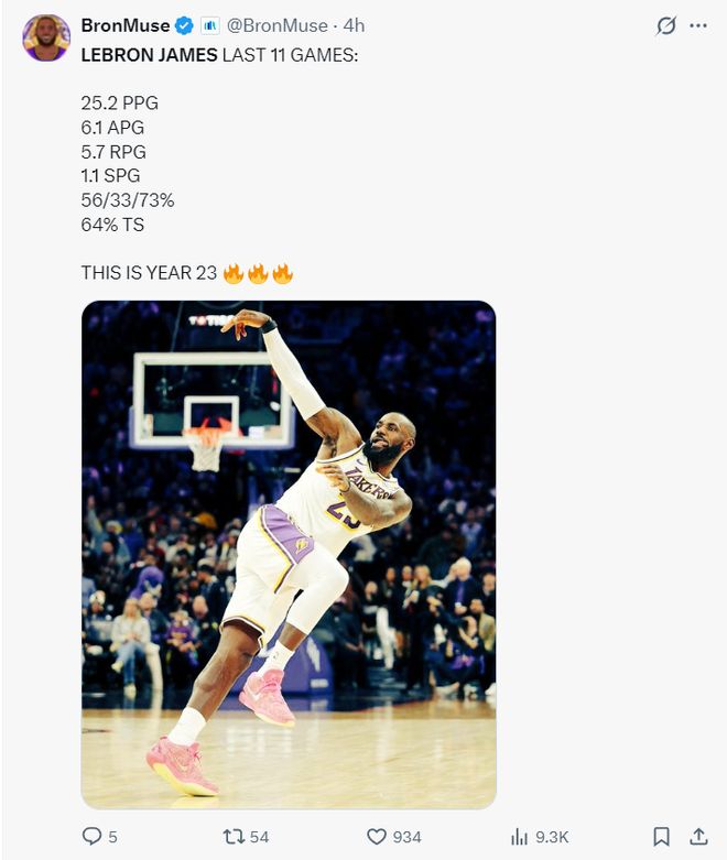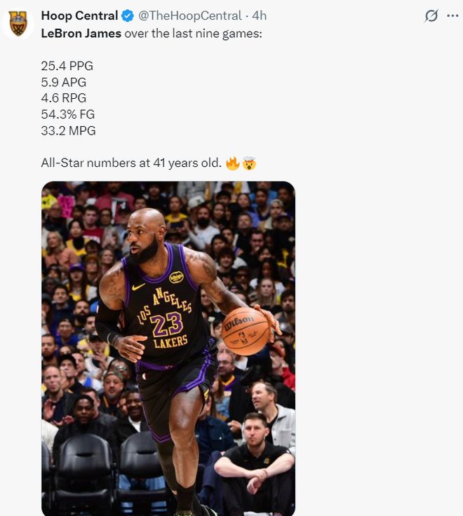 過去詹姆斯9場(chǎng)比賽,場(chǎng)均33.2分鐘,拿到25.4分5.9助攻4.6籃板,命中率54.3%,美媒認(rèn)為41歲的他還是有全明星水準(zhǔn)。