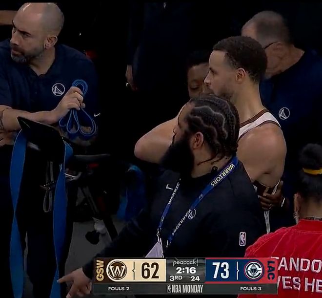 庫里第三節下場時在球員通道拉伸背部的位置,庫里疑似背部的肌肉有些不適,但庫里還是決定在末節先登場帶隊追分。