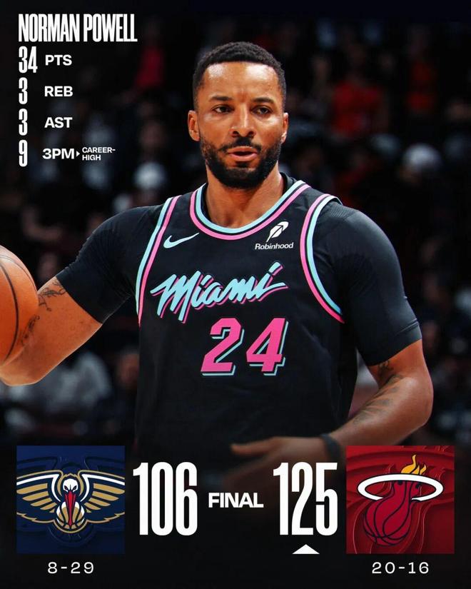 拿上一場比賽來說,熱火主場125-106大勝鵜鶘,鮑威爾全場只打了不到29分鐘,投籃15中11,三分12中9,罰球4中3,得到34分3籃板3助攻2搶斷。
