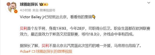 許指導沒有說太多,但北京男籃接下來的新外援是誰,賽前已經有不少球迷們都知道了,據媒體人趙探長的爆料,北京近期已經簽下了小外援維克托·貝利,貝利身高193cm,上賽季效力于德甲聯賽開姆尼茨隊,場均得到15.2分2.6籃板1.9助攻,本賽季效力斯洛文尼亞聯賽效力,場均能得到18.3分,三分命中率有4成,并且貝利也不是北京隊的唯一新援。