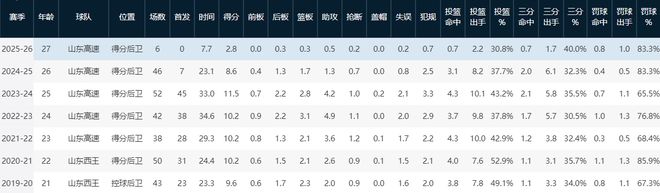 本賽季10場比賽打完,陳培東僅僅獲得了6次出場機會,且全部為替補出場,場均出場時間更是只有可憐的7.7分鐘。這樣的時長,不足他職業生涯以來任何一個賽季的三分之一。在極為有限的時間里,陳培東的各項數據也自然而然地大幅下滑,場均2.8分0.3籃板0.5助攻,完全找不到曾經球隊主力后衛的影子。