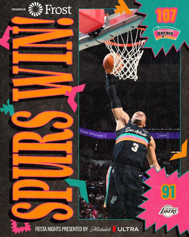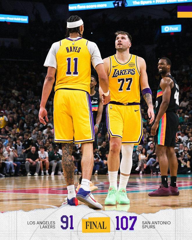 馬刺隊的約翰遜得到27分和6個籃板,文班亞馬得到16分和14個籃板,卡斯爾得到15分、5個籃板和4次助攻,??怂沟玫?4分和5個籃板,查帕涅得到11分和9個籃板。湖人隊的東契奇得到三雙38分、10個籃板和10次助攻,拉拉維亞得到16分和7個籃板,海耶斯得到10分和7個籃板,艾頓得到9分和6個籃板。