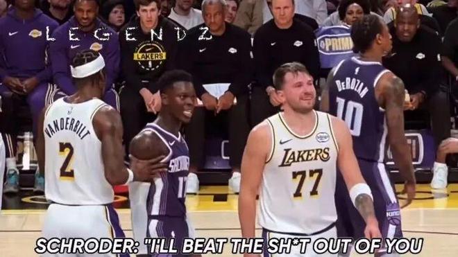 比賽過程中,國王隊后衛施羅德與湖人球星 盧卡·東契奇 就爆發了激烈口角,雙方的垃圾話交鋒堪稱白熱化。