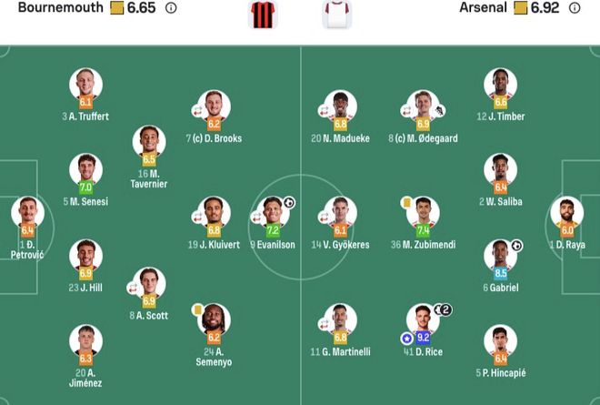 伯恩茅斯首發:1-佩特洛維奇、3-特呂費爾、5-塞內西、20-A·希門尼斯、23-詹姆斯·希爾、8-斯科特(74' 22-克魯皮)、19-克魯伊維特(74' 4-庫克)、7-布魯克斯(67' 21-阿明·阿德利)、9-埃瓦尼爾森(74' 26-于納爾)、16-塔韋尼耶、24-塞梅尼奧