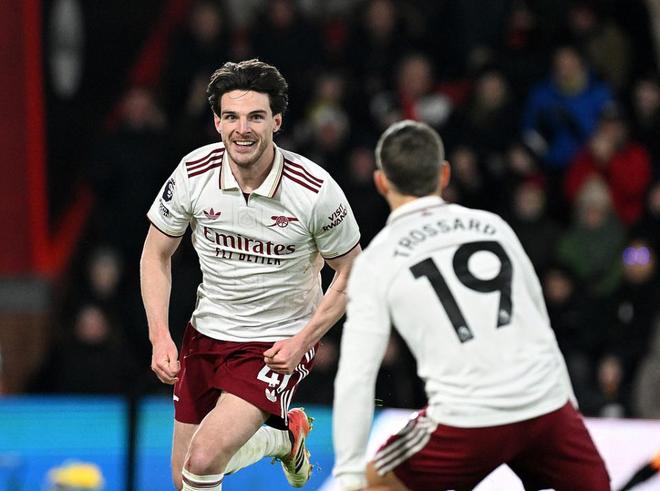 第71分鐘,厄德高斜傳,薩卡突入禁區倒三角傳球,賴斯跟進推射得手,阿森納3-1伯恩茅斯。這是身價1.2億歐元的賴斯,生涯首次在英超梅開二度。