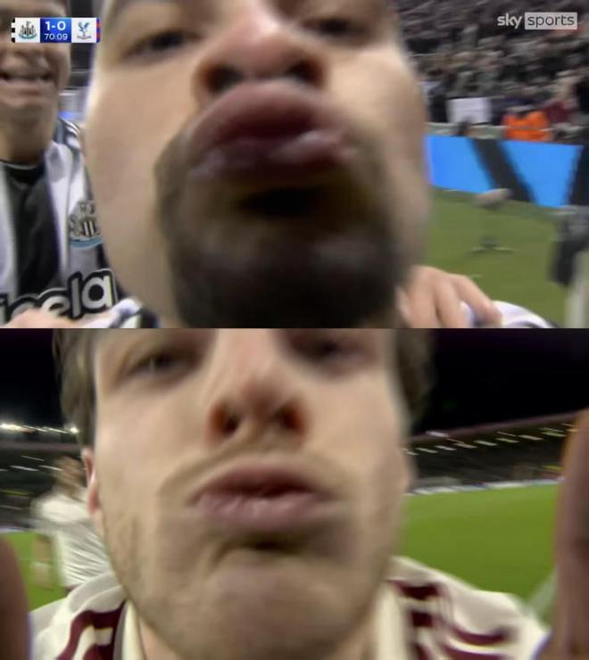 在紐卡vs水晶宮同樣的比賽第71分鐘,吉馬良斯頭球破門幫助紐卡取得領先,隨后他也親吻鏡頭慶祝。