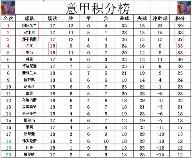 積分榜方面,國米主場輕取博洛尼亞后,又是以1分優勢超過AC米蘭,奪回榜首。那不勒斯也不甘示弱,完勝拉齊奧后,也還是1分之差緊追AC米蘭,領先第4的尤文,第5的羅馬4分,坐穩第3的位置。