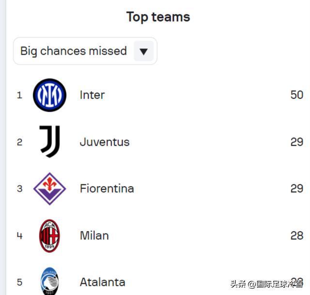 此戰勞塔羅3次浪費“黃金機會”,小圖拉姆和皮奧各有1次,單場比賽就5次浪費良機,也讓國米在意甲浪費黃金機會的榜單上的領先優勢進一步擴大——50次浪費黃金機會的國米,領先第二名已達21次之多。