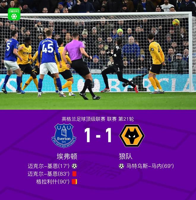 北京時間1月8日英格蘭足球頂級聯賽 聯賽 第21輪,埃弗頓主場對陣狼隊。埃弗頓邁克爾-基恩破門。狼隊馬特烏斯-馬內破門。最終比分埃弗頓 1-1 狼隊。