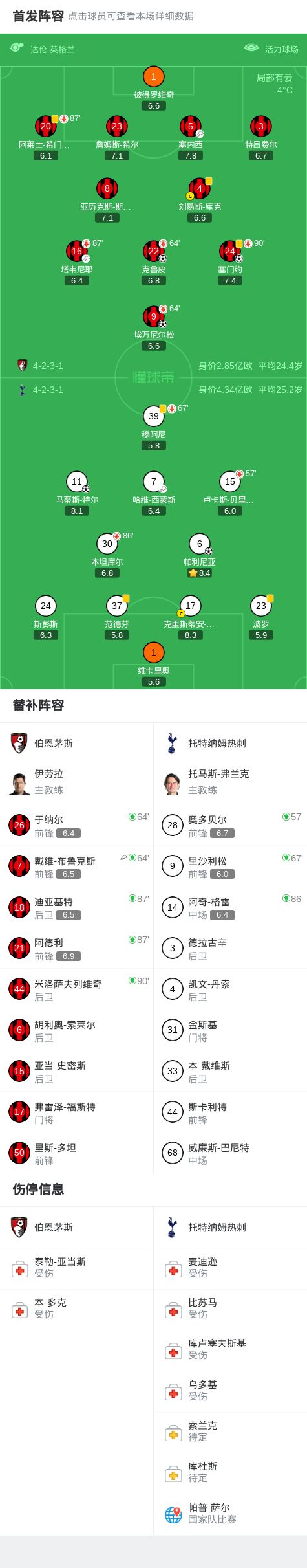 第36分鐘,塞內西助攻克魯皮破門,伯恩茅斯2-1熱刺